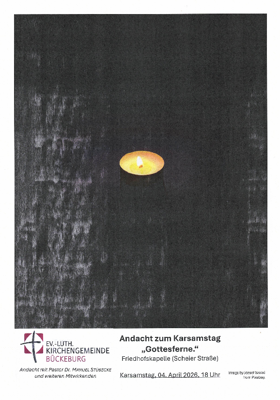 Andacht zum Karsamstag "Gottesferne" Meldung vom 28.02.2026 Kategorie: Stadtkirchengemeinde Karsamstag, 4. April 2026 um 18 Uhr in der Friedhofskapelle Andacht mit Pastor Dr. Manuel Stübecke und weiteren Mitwirkenden. < Ostergottesdienste Zur Übersichtsseite Babysprechstunde mit der Familienhebamme Manuela Becker >