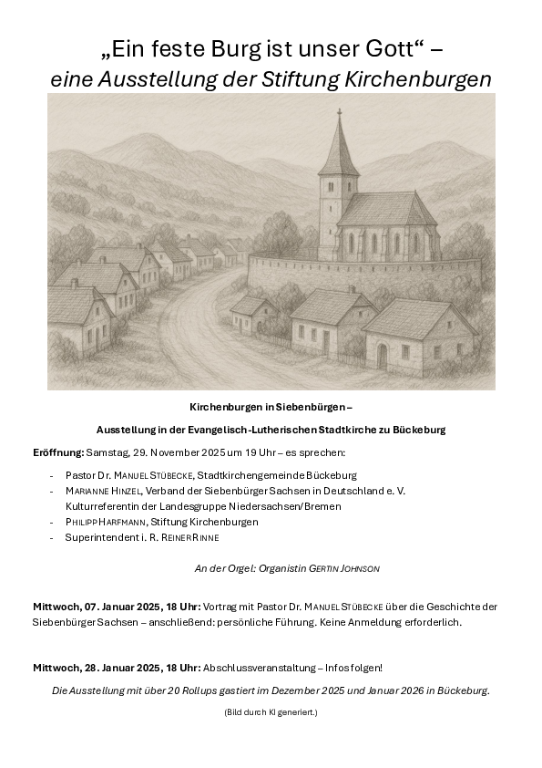 Die Evangelisch-Lutherische Kirchengemeinde zu Bückeburg zeigt im Dezember 2025 und Januar 2026 in der Stadtkirche die Wanderausstellung „Ein feste Burg ist unser Gott“ der Stiftung Kirchenburgen. Auf über 20 großformatigen Rollups werden die Kirchenburgen Siebenbürgens vorgestellt, ein europaweit einzigartiges Kulturerbe. Die Ausstellung ermöglicht einen eindrucksvollen Blick auf Baukunst, Geschichte und Glauben der Siebenbürger Sachsen, die diese Befestigungsanlagen über Jahrhunderte geprägt haben. Eröffnung am Samstag, 29. November 2025, um 19 Uhr Zur Vernissage am Vorabend des 1. Advents sind Gemeinde und Öffentlichkeit herzlich eingeladen. Es sprechen: • Pastor Dr. Manuel Stübecke, Stadtkirchengemeinde Bückeburg • Marianne Hinzel, Verband der Siebenbürger Sachsen in Deutschland e. V. Kulturreferentin der Landesgruppe Niedersachsen/Bremen • Philipp Harfmann, Stiftung Kirchenburgen • Superintendent i. R. Reiner Rinne.