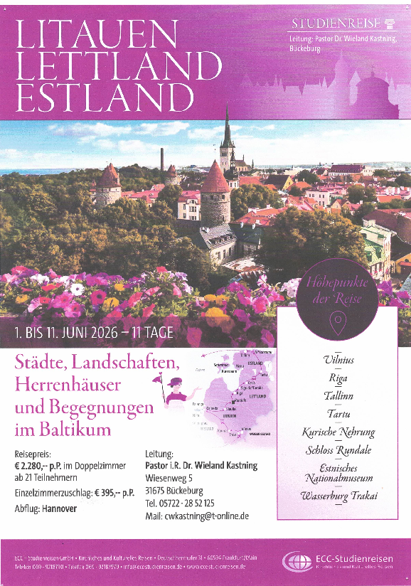 Flugreise ins Baltikum: Litauen - Lettland - Estland Meldung vom 08.10.2025 Kategorie: Stadtkirchengemeinde 1 - 11. Juni 2026 Weitere Infos erhalten Sie bei Pastor i.R. Wieland Kastning, Tel. 05722-2852125, 0152-52764049 < Sie werden gesucht! Zur Übersichtsseite Weihnachtsgottesdienste >