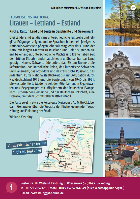 Flugreise ins Baltikum: Litauen - Lettland - Estland Meldung vom 01.09.2025 Kategorie: Stadtkirchengemeinde Voraussichtlicher Termin: 1 - 10. Juni 2026 Weitere Infos erhalten Sie bei Pastor i.R. Wieland Kastning, Tel. 05722-2852125, 0152-52764049 < Sie werden gesucht! Zur Übersichtsseite Besuchsdienst für Senioren – Verstärkung gesucht! >