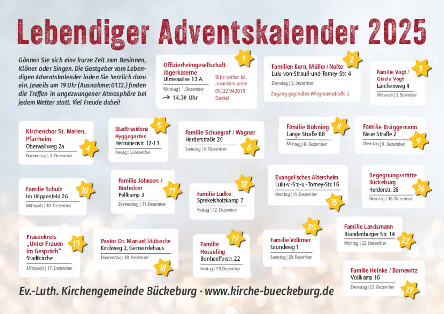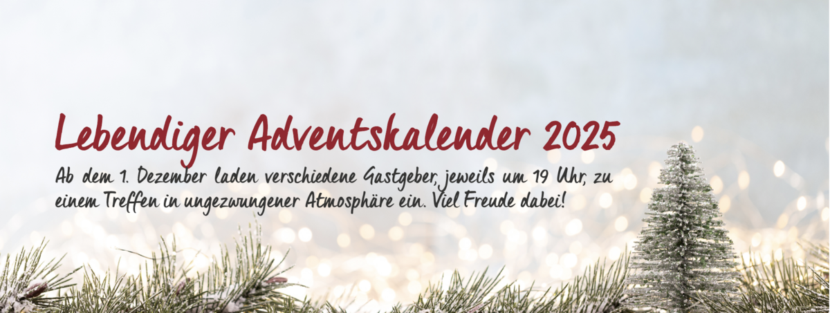 Auch in diesem Jahr findet wieder der lebendige Adventskalender statt. Gemeinschaft und Begegnung stehen im Vordergrund. Lieder, Geschichten und Lichter laden bei einem Glas Punsch ein, sich auf Weihnachten einzustimmen.