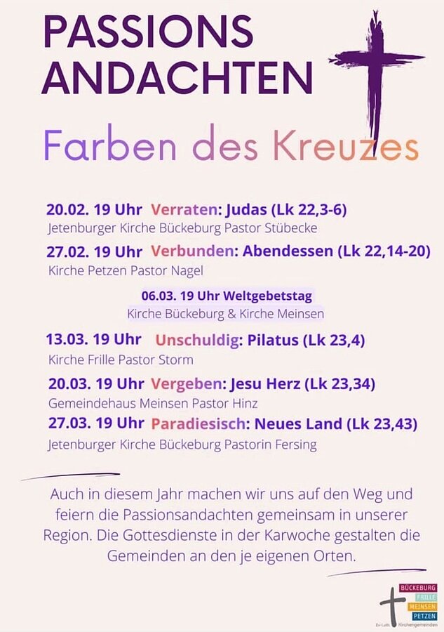 Auch in diesem Jahr machen wir uns gemeinsam auf den Weg und feiern die Passionsandachten gemeinsam in unserer Region. Die Gottesdienste in der Karwoche gestalten die Gemeinden an den je eigenen Orten.