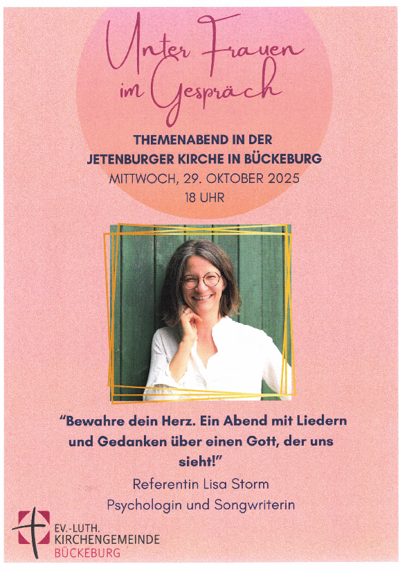 "Unter Frauen im Gespräch" - Themenabend Meldung vom 10.09.2025 Kategorie: Stadtkirchengemeinde Mittwoch, 29. Oktober 2025 um 18 Uhr in der Jetenburger Kirche "Bewahre dein Herz. Ein Abend mit Liedern und Gedanken über einen Gott, der uns sieht." Referentin Lisa Storm, Psychologin und Songwriterin. < Weihnachtsbaum gesucht! Zur Übersichtsseite Friedenskonzert >